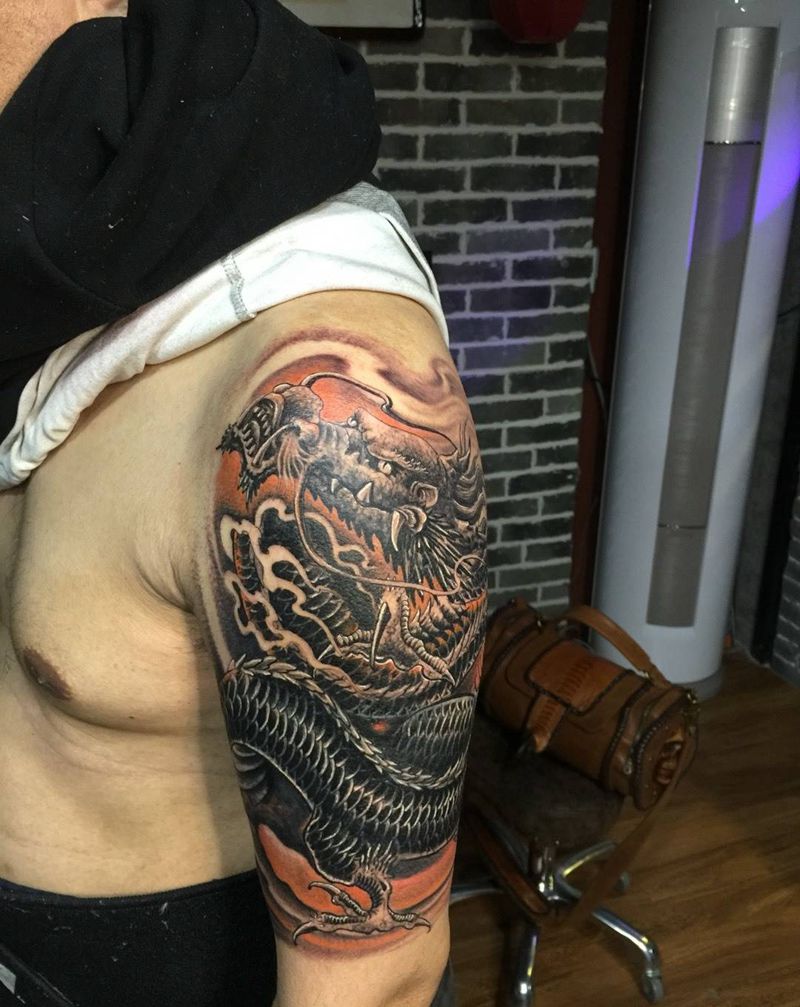 当前位置: 首页 >山东省济南市纹身店-翰墨刺青纹身图案>遮盖龙纹身图片_手臂传统成品神兽纹身图案