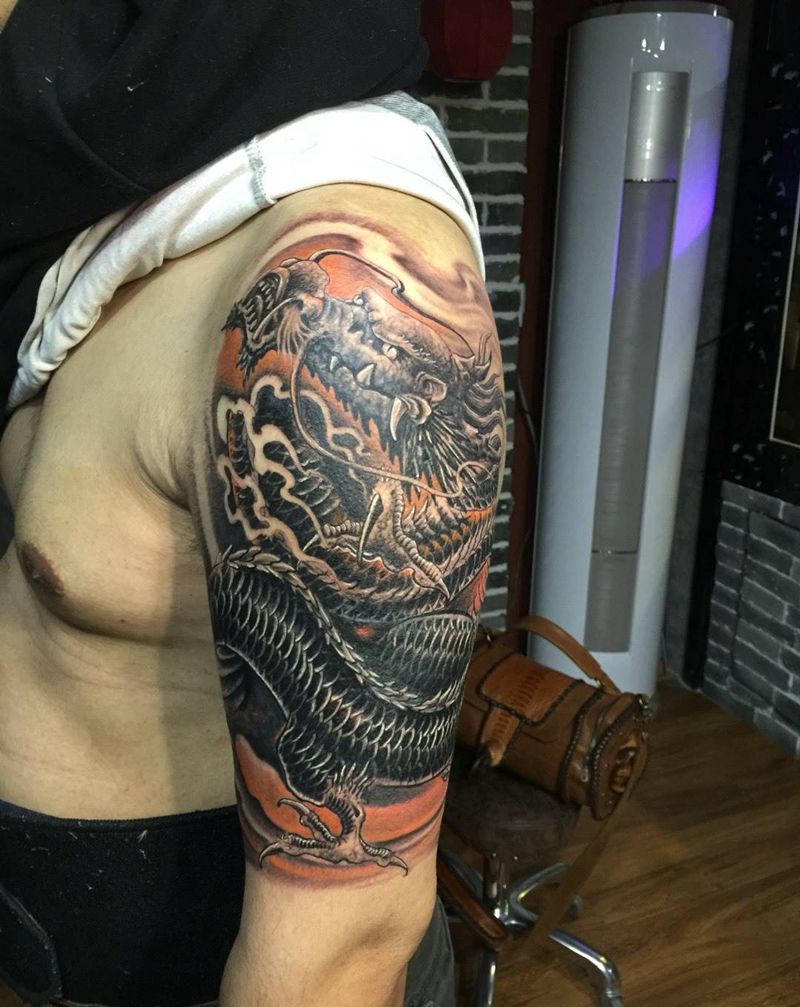 当前位置: 首页 >山东省济南市纹身店-翰墨刺青纹身图案>遮盖龙纹身图片_手臂传统成品神兽纹身图案