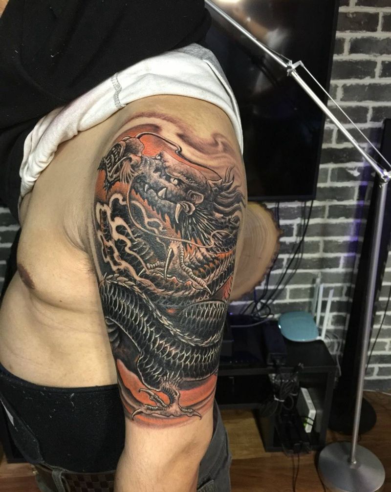 当前位置: 首页 >山东省济南市纹身店-翰墨刺青纹身图案>遮盖龙纹身图片_手臂传统成品神兽纹身图案