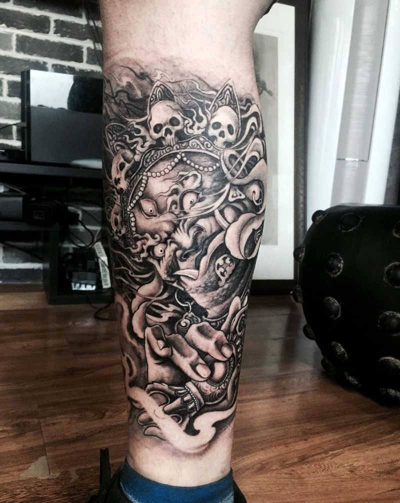 当前位置: 首页 >山东省济南市纹身店-翰墨刺青纹身图案>护法纹身图片_成品腿部传统宗教纹身图案