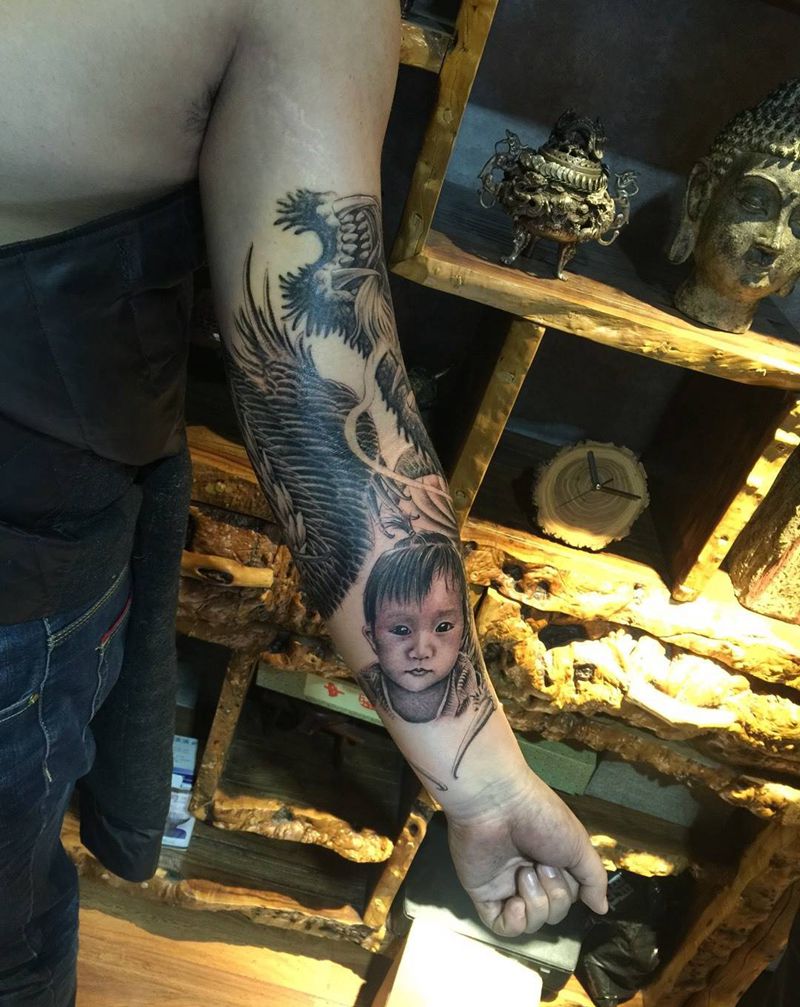 当前位置: 首页 >山东省济南市纹身店-翰墨刺青纹身图案>佑护纹身图片_手臂传统成品宗教神兽纹身图案