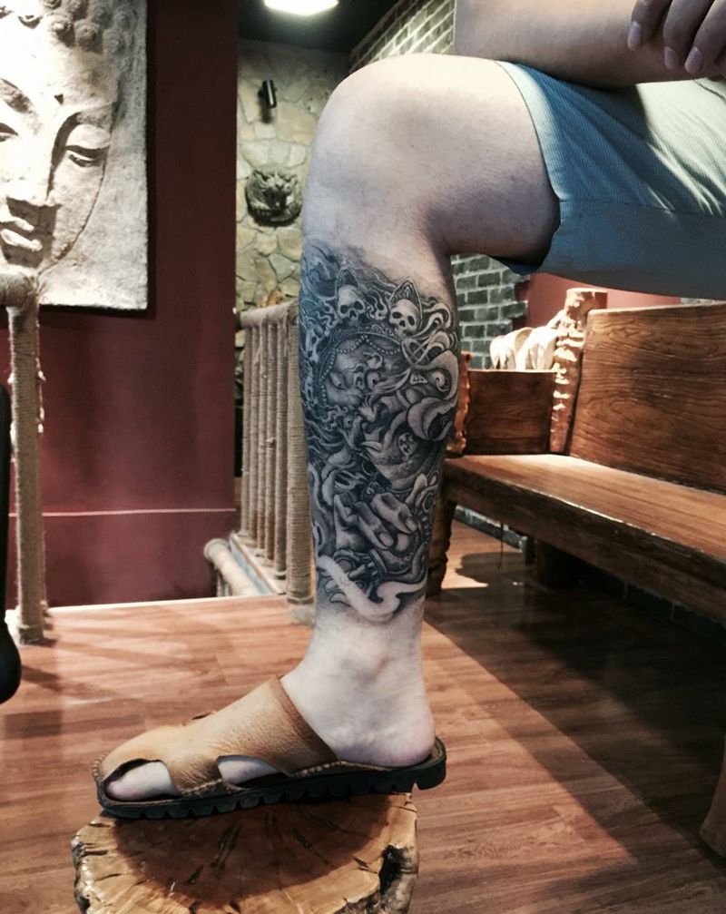 护法大势至包小腿纹身图片_成品腿部传统宗教纹身图案