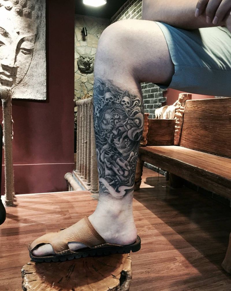 当前位置: 首页 >山东省济南市纹身店-翰墨刺青纹身图案>护法大势至包小腿纹身图片_成品腿部传统宗教纹身图案