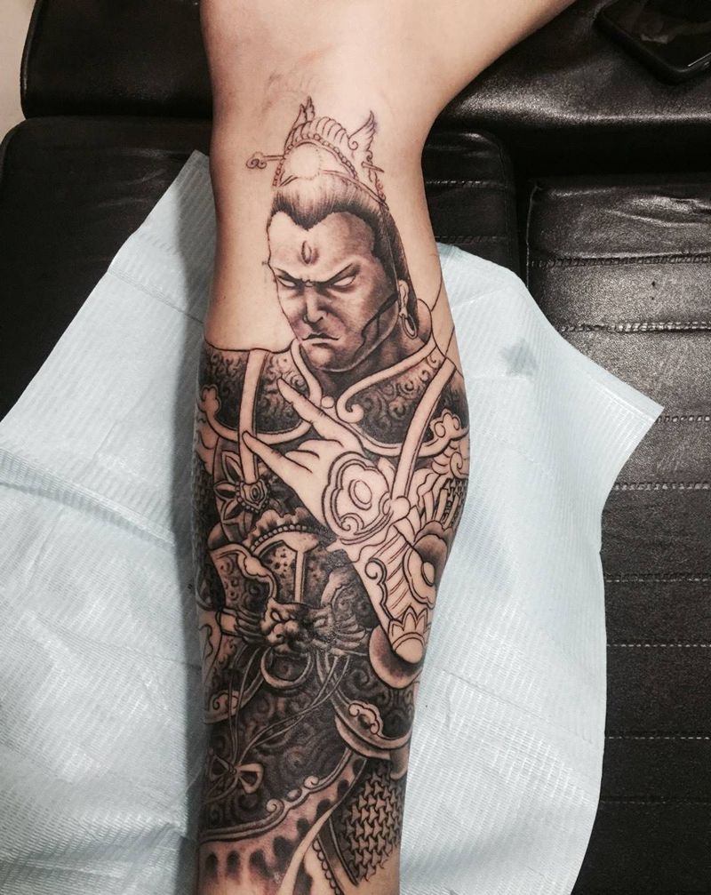花腿之二郎显圣纹身图片_成品腿部传统宗教纹身图案