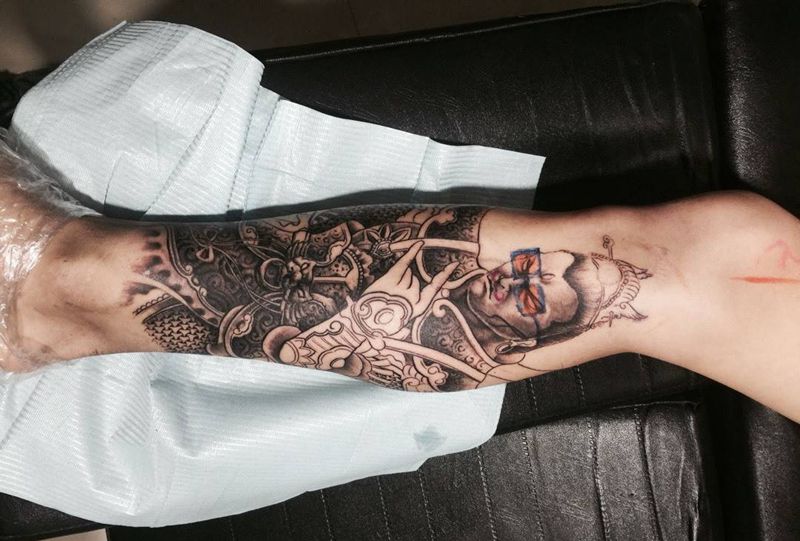 花腿之二郎显圣纹身图片_成品腿部传统宗教纹身图案
