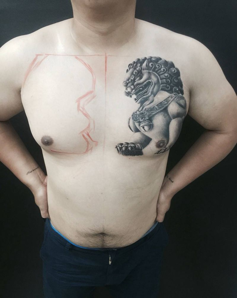 双狮花胸纹身图片_成品胸部传统宗教神兽纹身图案