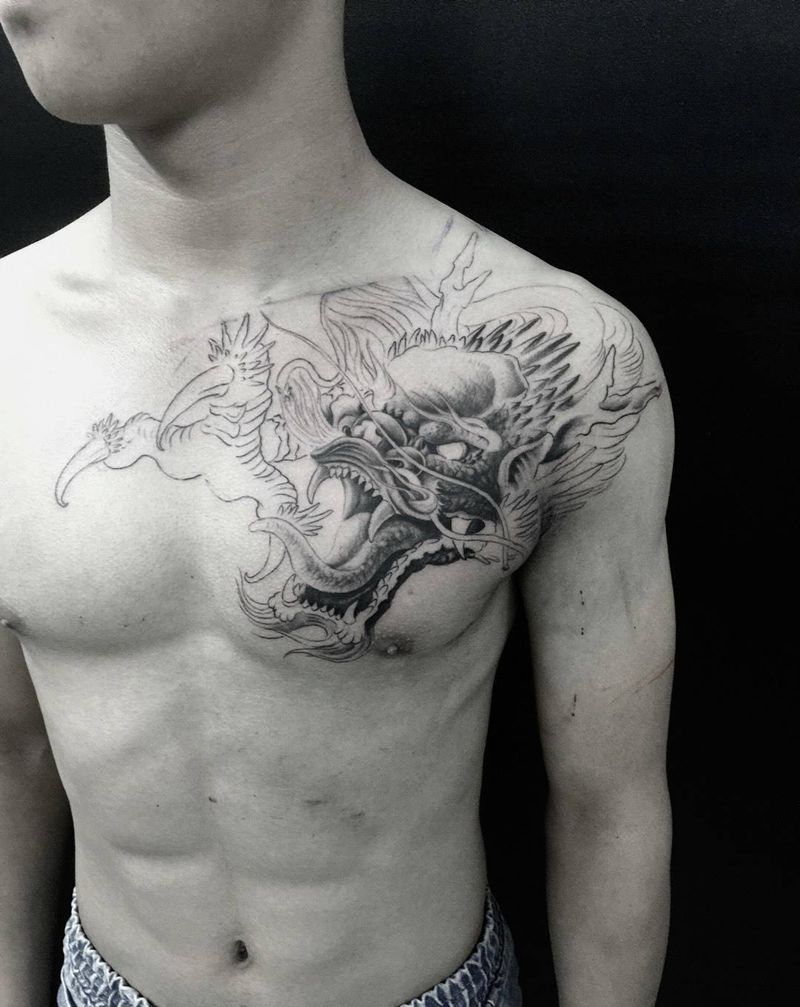 龙头纹身图片_成品胸部传统宗教神兽纹身图案