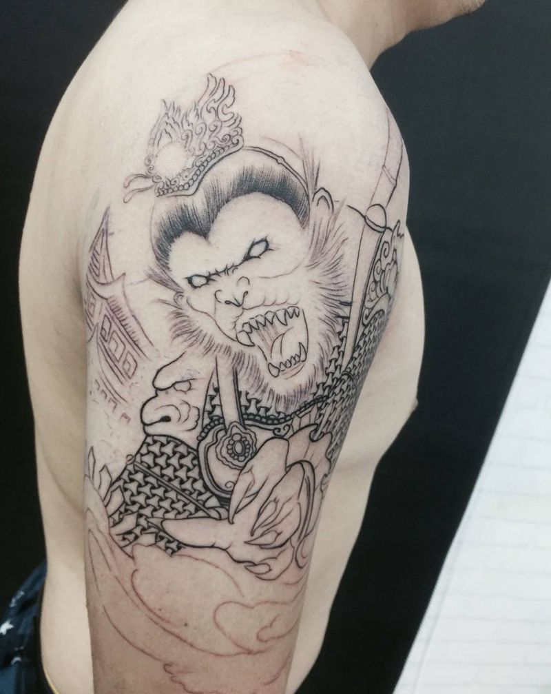 放肆桀骜纹身图片_成品手臂传统宗教齐天大圣纹身图案