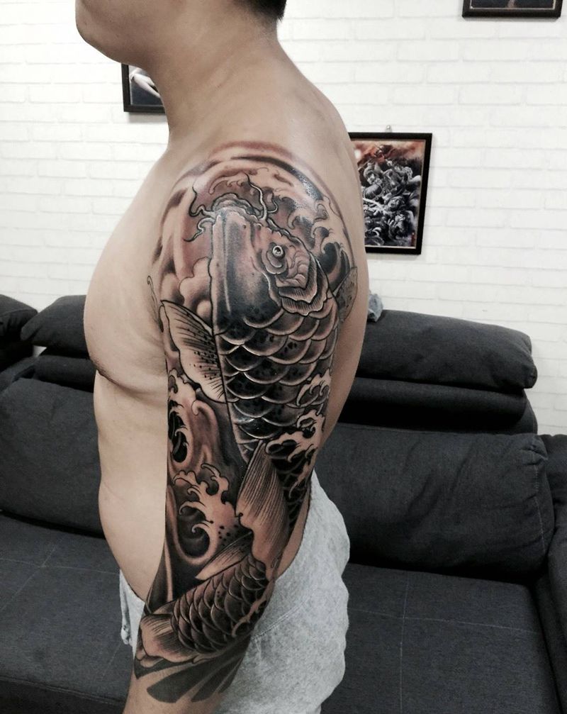 当前位置: 首页 >山东省济南市纹身店-翰墨刺青纹身图案>七分袖鱼纹身图片