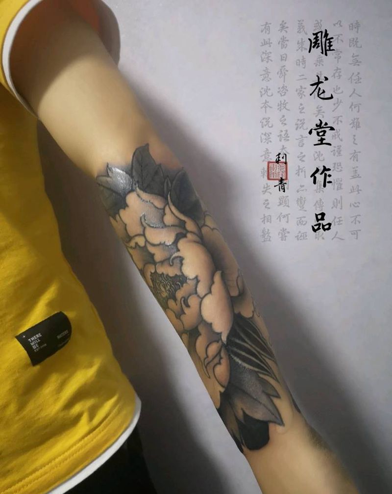 牡丹花臂纹身图片_手臂新传统牡丹花臂纹身图案