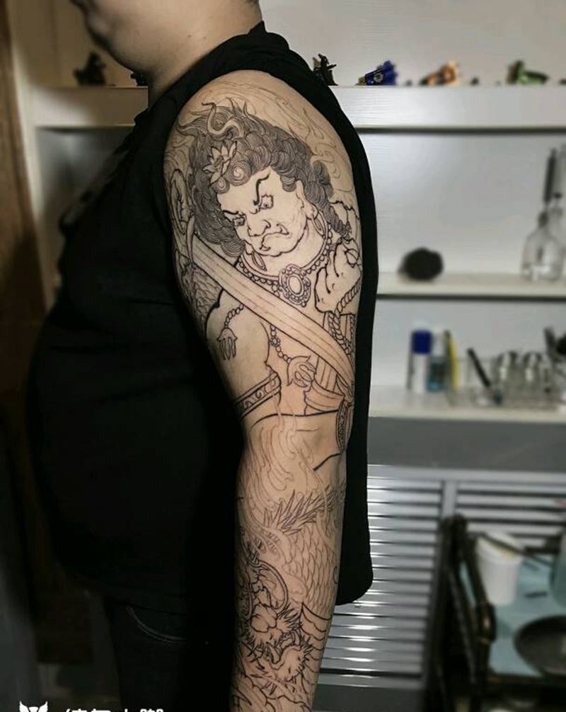当前位置: 首页 >山东省济南市纹身店-鬼工刺青纹身图案>传统花臂不动明王线条工事纹身图片