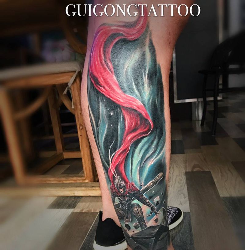 • T网红王老大花腿龙纹身图片_腿部新传统纹身图案