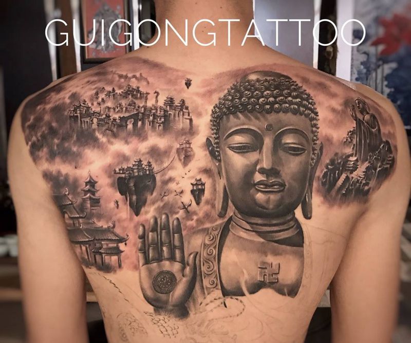 佛纹身图片_背部肩部新传统欧美写实纹身图案