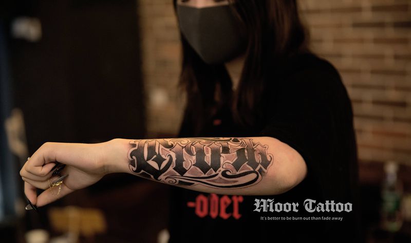 当前位置: 首页 >山东省青岛市纹身店-荒野刺青纹身图案>花体英文原创设计纹身图片_手臂花体字纹身图案