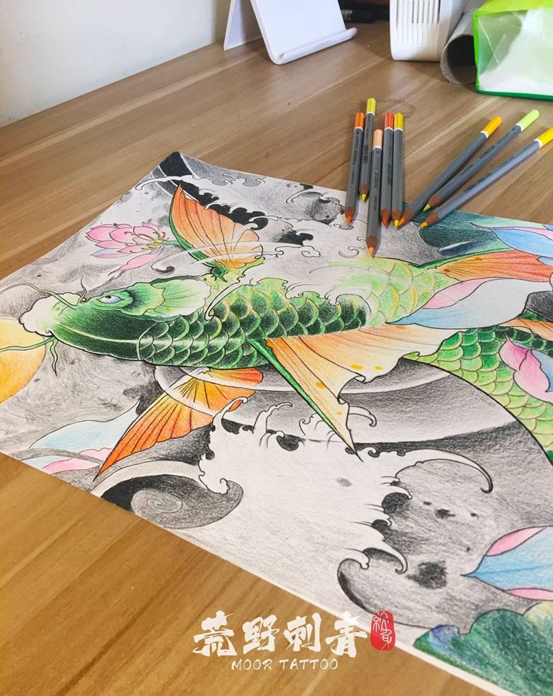 当前位置: 首页 >山东省青岛市纹身店-荒野刺青纹身图案>新传统鲤鱼手稿纹身图片