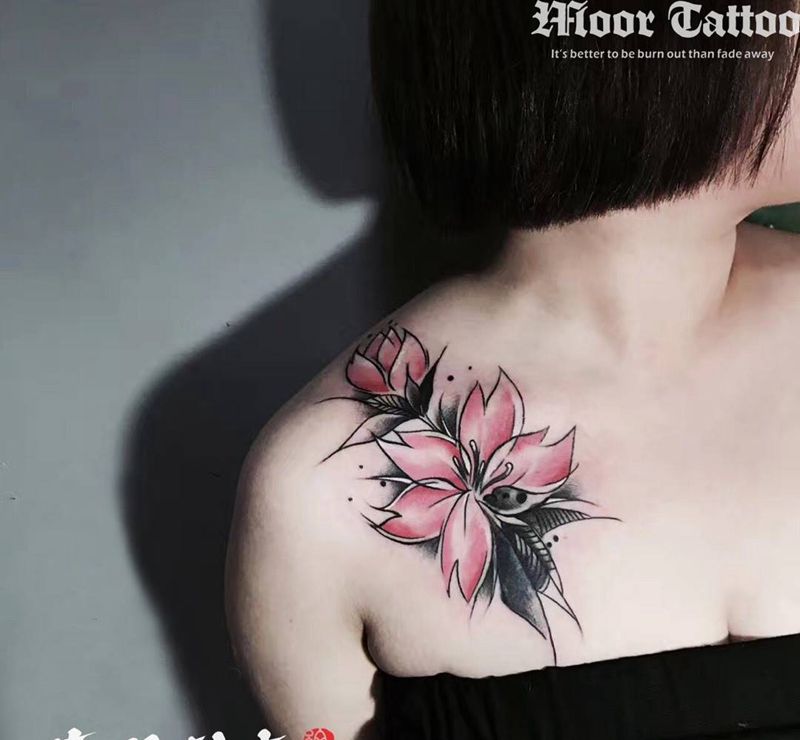 小花花纹身图片_肩部手稿国画植物纹身图案