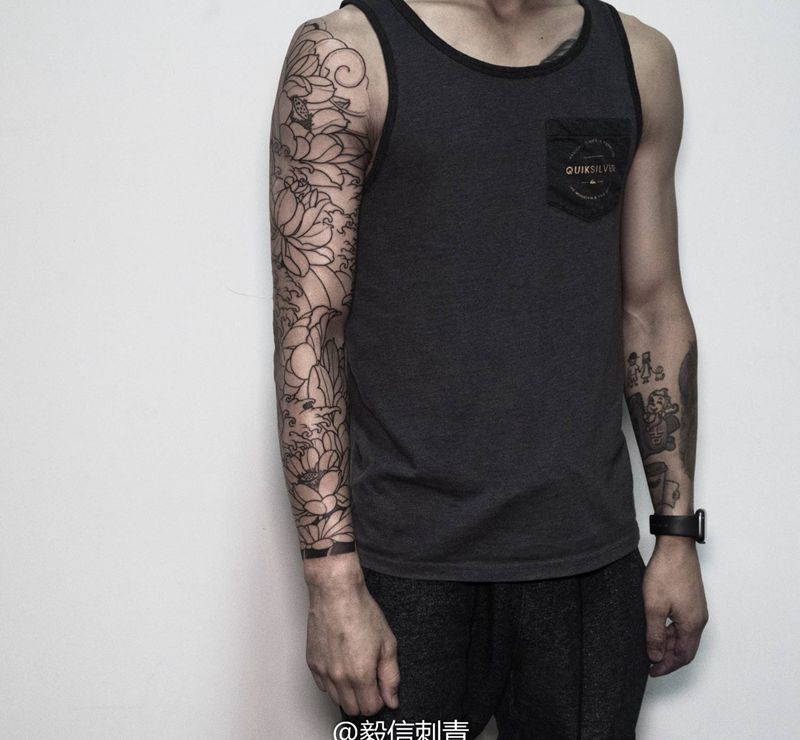 荷花花臂未完待续纹身图片_手臂新传统纹身图案