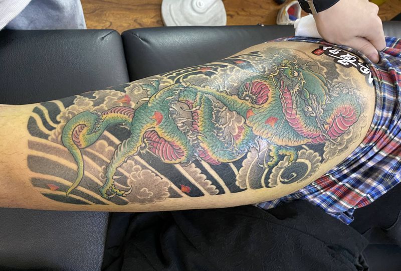 • T网红王老大花腿龙纹身图片_腿部新传统纹身图案
