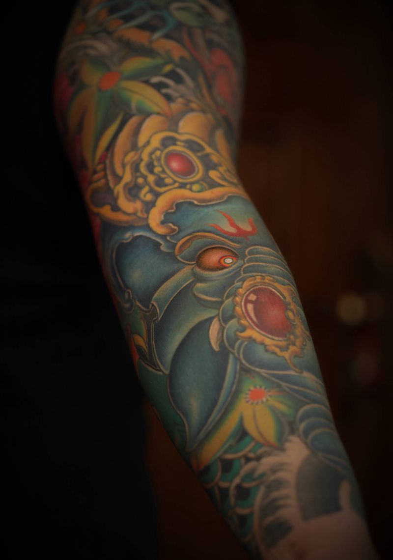 当前位置: 首页 >山东省青岛市纹身店-*和興刺青社*纹身图案>花臂修改纹身图片_手臂背部新传统水彩修改 遮盖彩色纹身图案