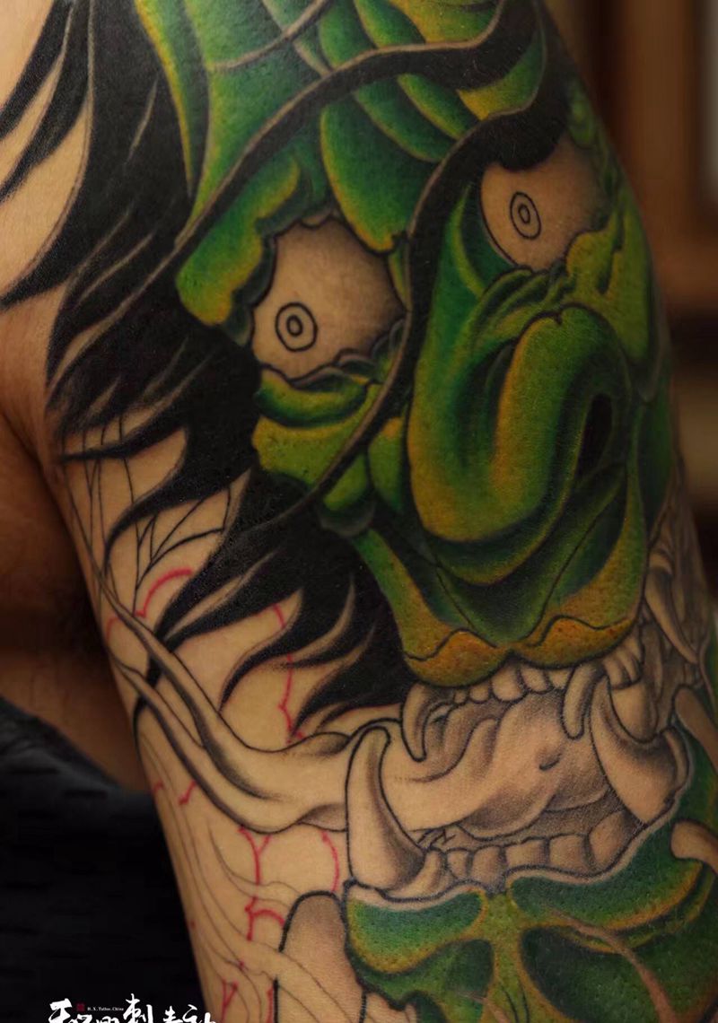 当前位置: 首页 >山东省青岛市纹身店-*和興刺青社*纹身图案>《不畏惧人生》纹身图片_肩部手臂新传统老传统般若面具菩萨纹身图案