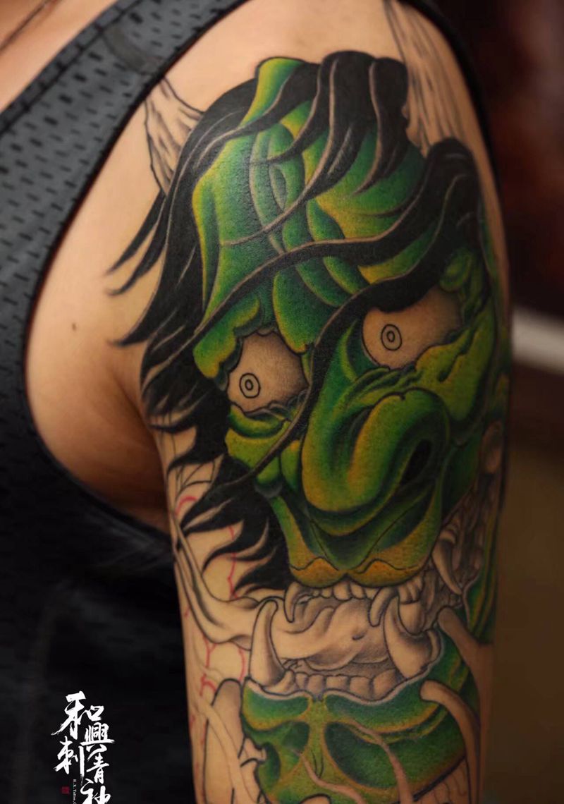 当前位置: 首页 >山东省青岛市纹身店-*和興刺青社*纹身图案>《不畏惧人生》纹身图片_肩部手臂新传统老传统般若面具菩萨纹身图案