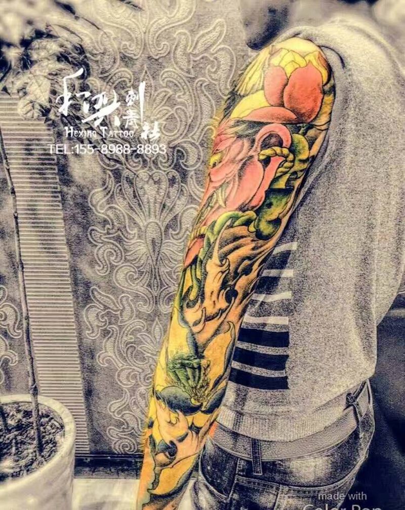 当前位置: 首页 >山东省青岛市纹身店-*和興刺青社*纹身图案>传统风格花臂(重彩)纹身图片_手臂传统人物宗教原创成品纹身图案