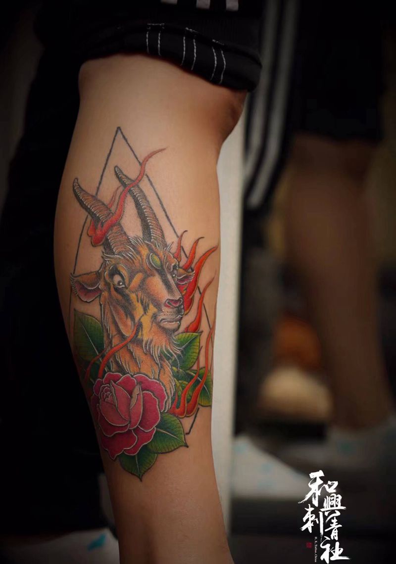 当前位置: 首页 >山东省青岛市纹身店-*和興刺青社*纹身图案>《羊姐》纹身图片_腿部手臂新传统New School彩色花腿羊纹身图案