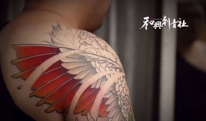 当前位置: 首页 >山东省青岛市纹身店-*和興刺青社*纹身图案>《凤翅》纹身图片_手臂背部新传统老传统凤凰翅膀重彩纹身图案