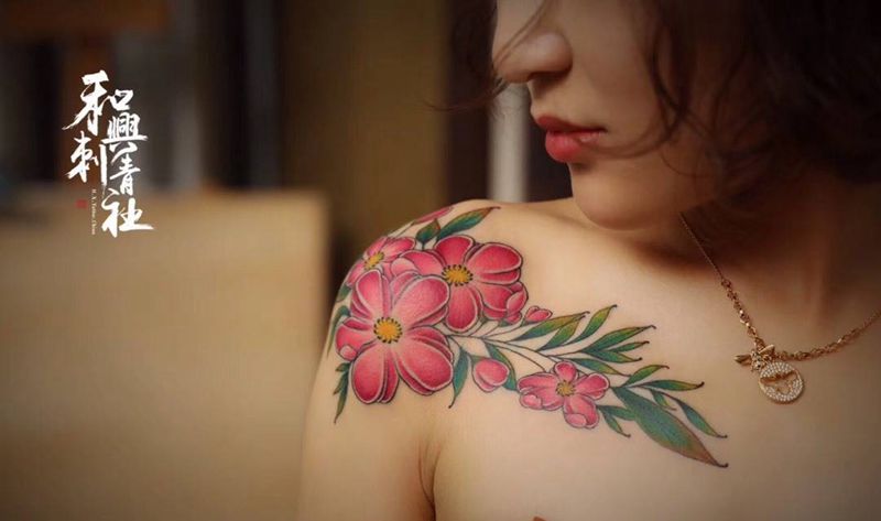 《肩花》纹身图片_颈部肩部新传统水彩花小清新女生纹身图案