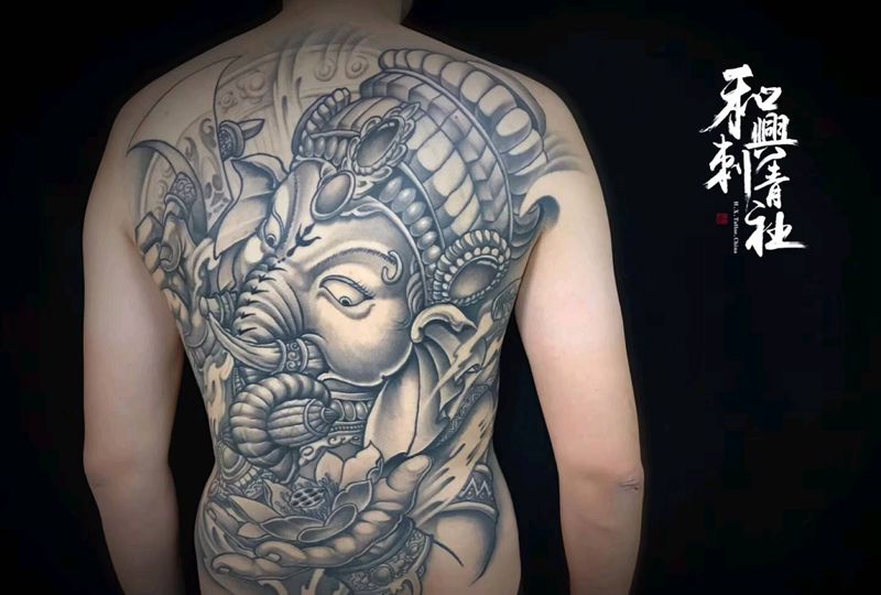 《象神满背》纹身图片_背部传统鬼神成品纹身图案