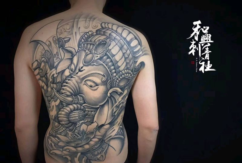 当前位置: 首页 >山东省青岛市纹身店-*和興刺青社*纹身图案>《象神满背》纹身图片_背部传统鬼神成品纹身图案
