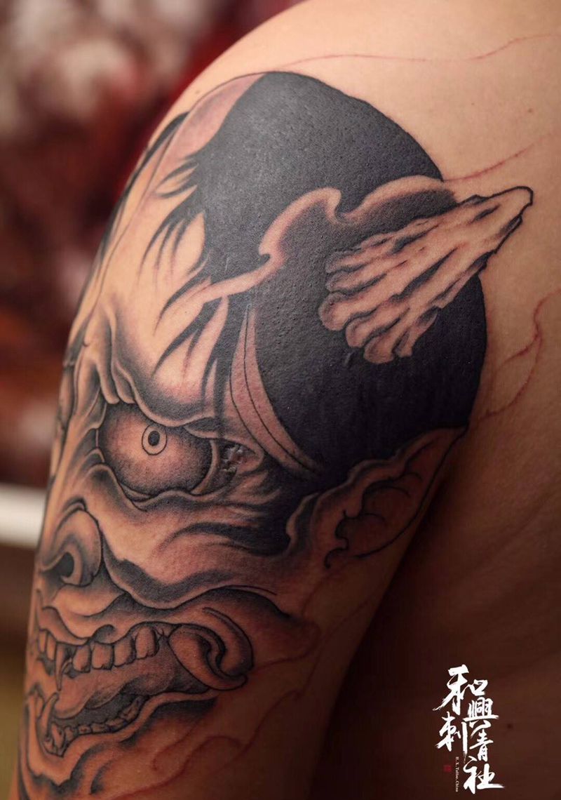 当前位置: 首页 >山东省青岛市纹身店-*和興刺青社*纹身图案>《般若》纹身图片_手臂腿部新传统般若花腿 黑灰纹身图案