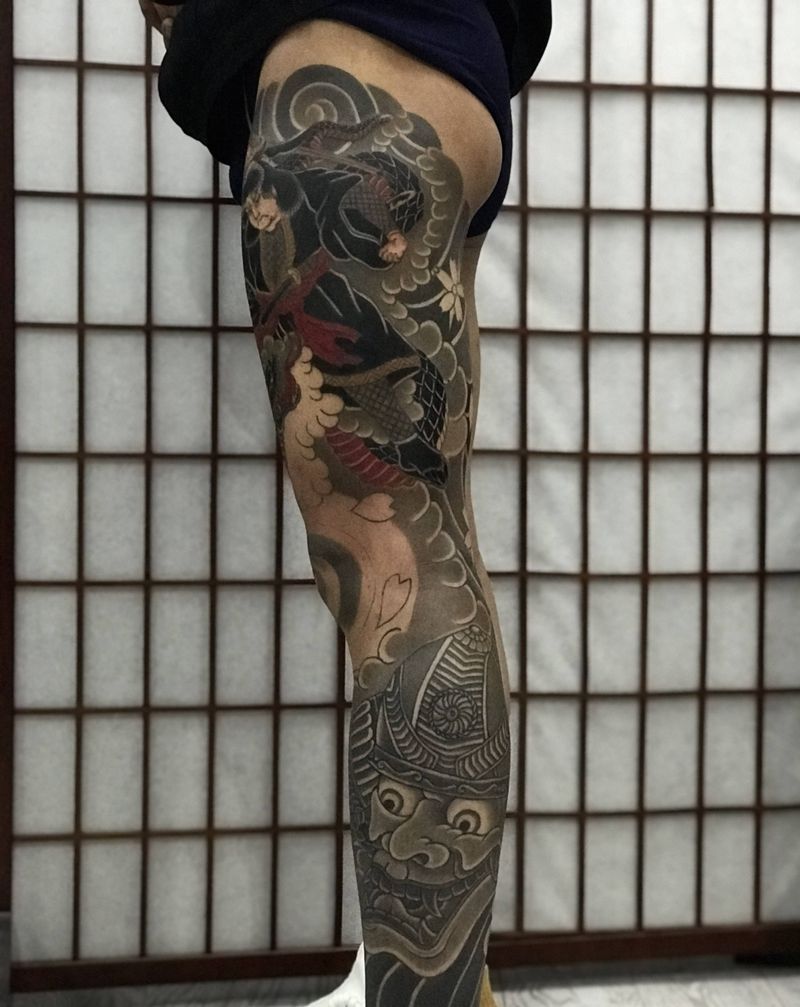 • T网红王老大花腿龙纹身图片_腿部新传统纹身图案