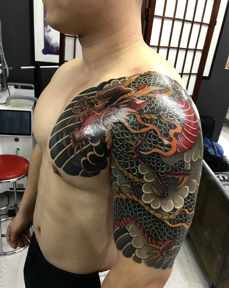 当前位置: 首页 >山东省青岛市纹身店-八玖刺青纹身图案>半胛龙纹身图片_老传统纹身图案