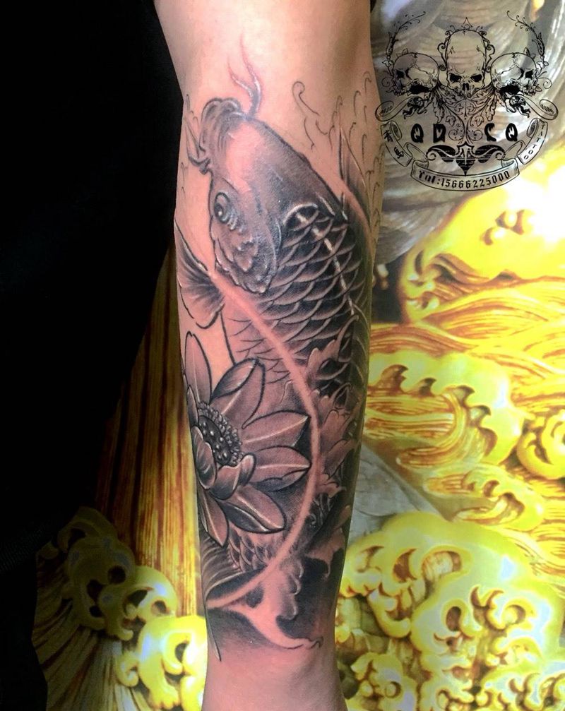 当前位置: 首页 >山东省青岛市纹身店-八玖刺青纹身图案>鲤鱼包小臂 下次继续。鱼头是恢复十天后的纹身图片
