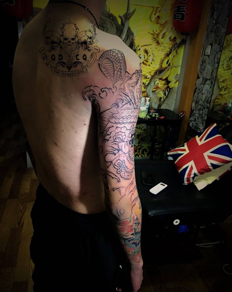 老顾客接花臂。在本工作室第二条花臂。又预约10月份的满背纹身图片