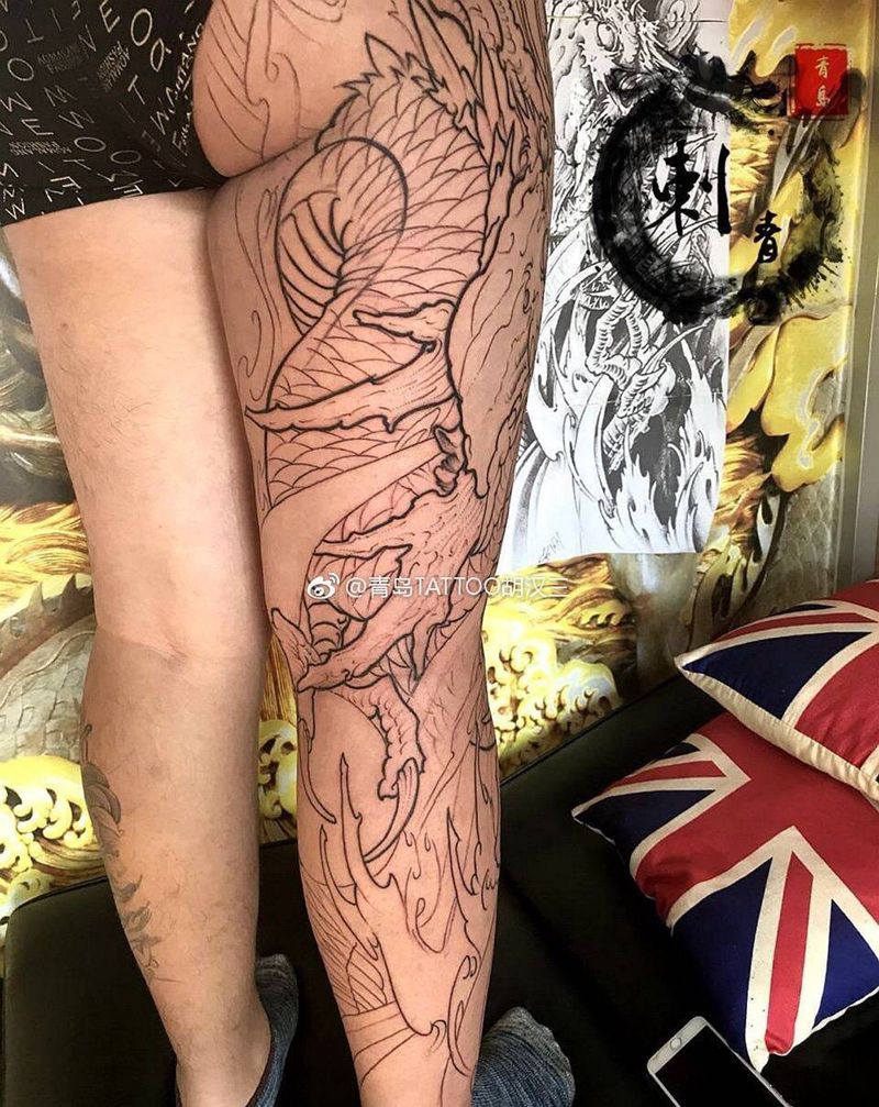 • T网红王老大花腿龙纹身图片_腿部新传统纹身图案