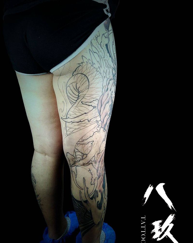 • T网红王老大花腿龙纹身图片_腿部新传统纹身图案