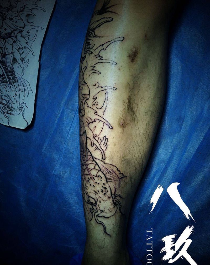 • T网红王老大花腿龙纹身图片_腿部新传统纹身图案