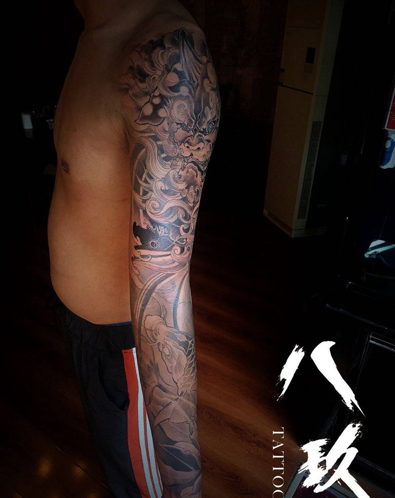 当前位置: 首页 >山东省青岛市纹身店-八玖刺青纹身图案>唐狮鲤鱼花臂纹身图片