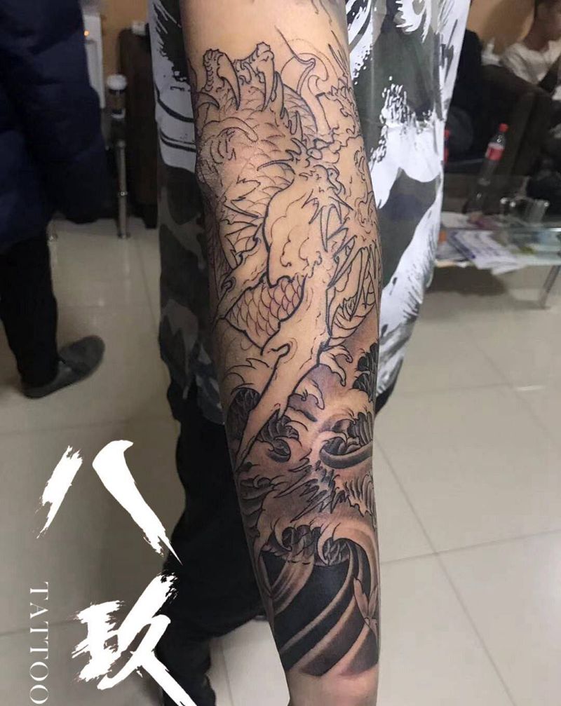 • T网红王老大花腿龙纹身图片_腿部新传统纹身图案