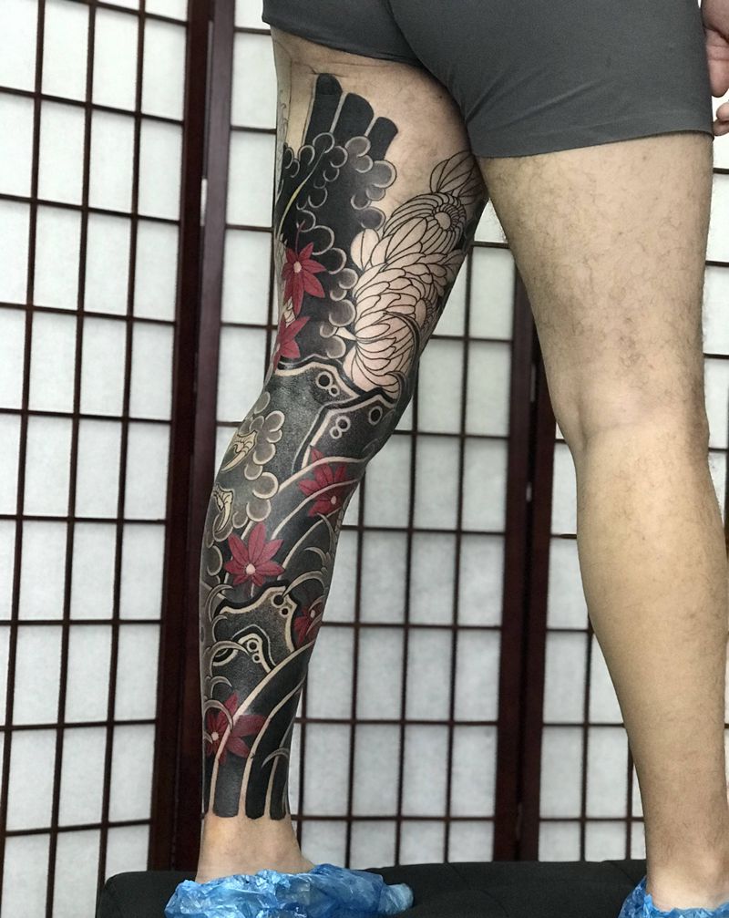 • T网红王老大花腿龙纹身图片_腿部新传统纹身图案