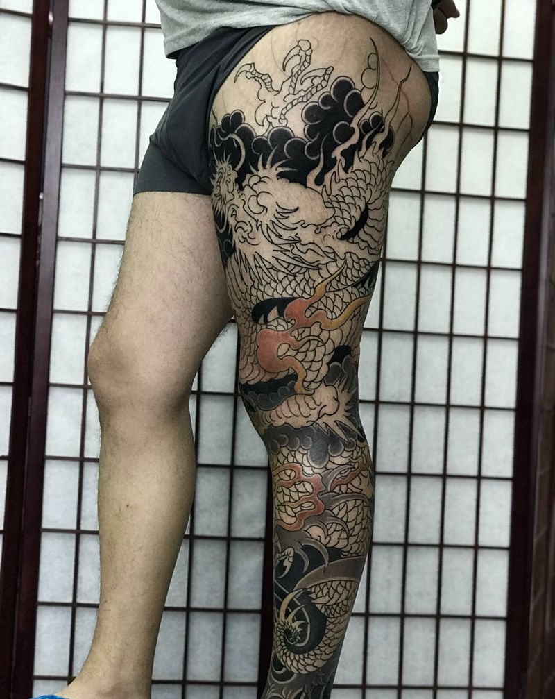 • T网红王老大花腿龙纹身图片_腿部新传统纹身图案