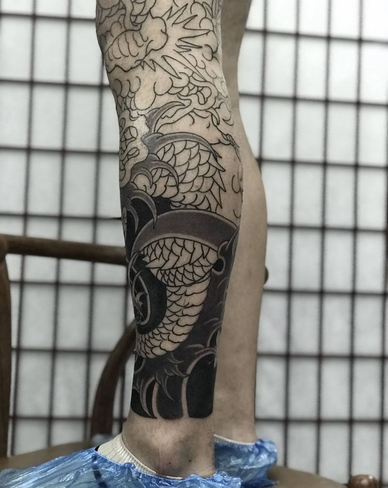 • T网红王老大花腿龙纹身图片_腿部新传统纹身图案