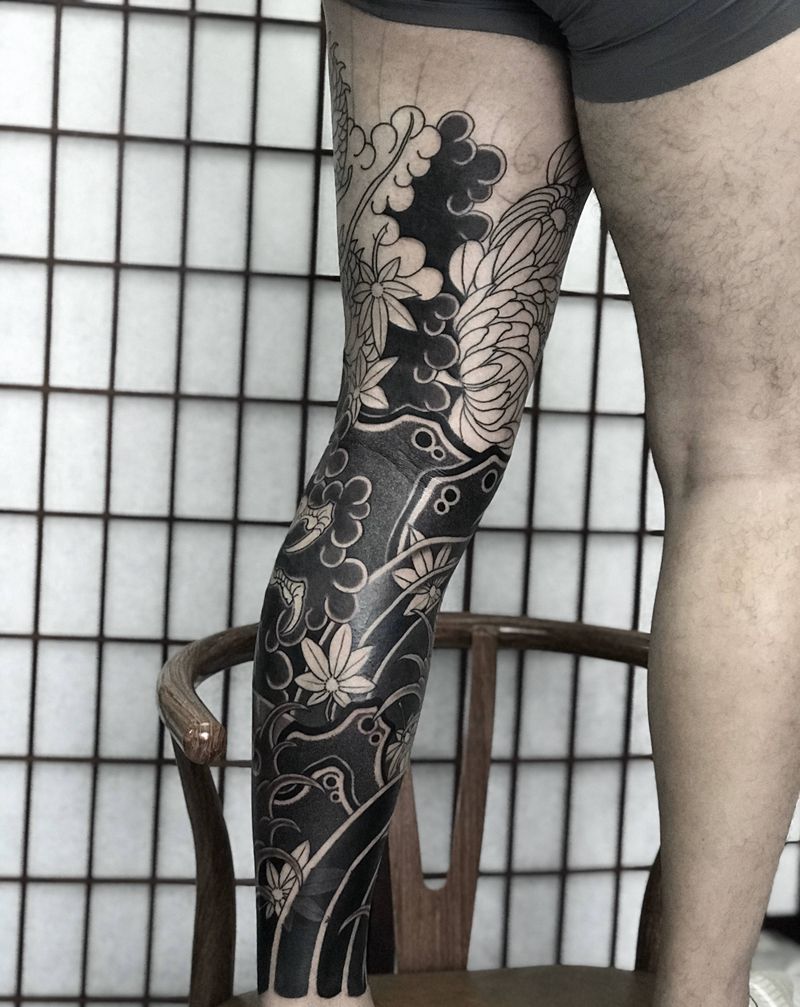 • T网红王老大花腿龙纹身图片_腿部新传统纹身图案