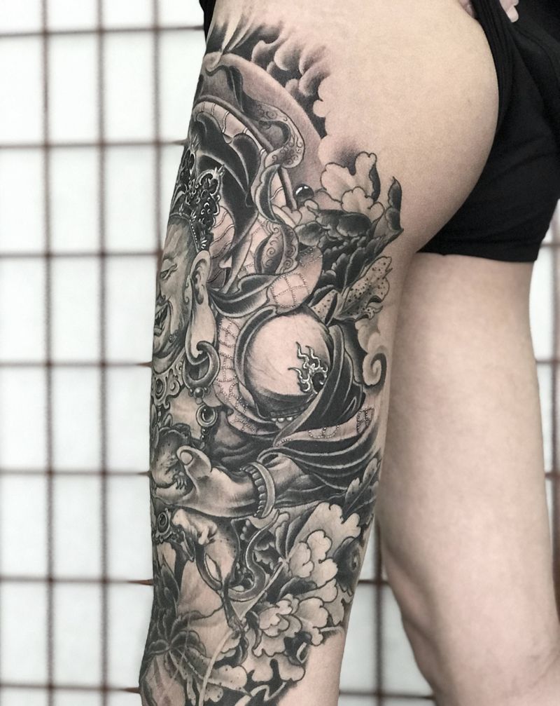 • T网红王老大花腿龙纹身图片_腿部新传统纹身图案