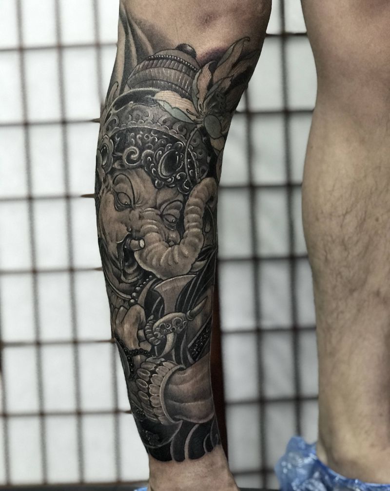 当前位置: 首页 >山东省青岛市纹身店-八玖刺青纹身图案>象神包小腿纹身图片_腿部新传统纹身图案