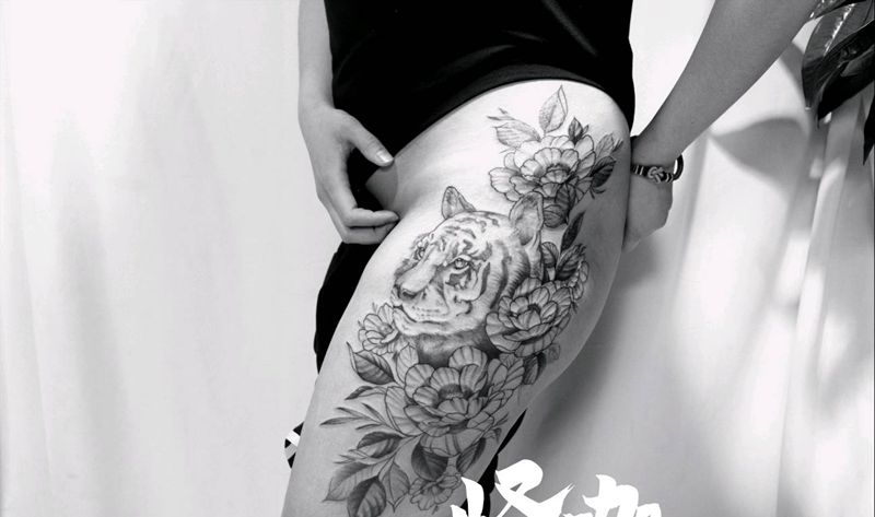 虎嗅蔷薇纹身图片_腿部点刺纹身图案