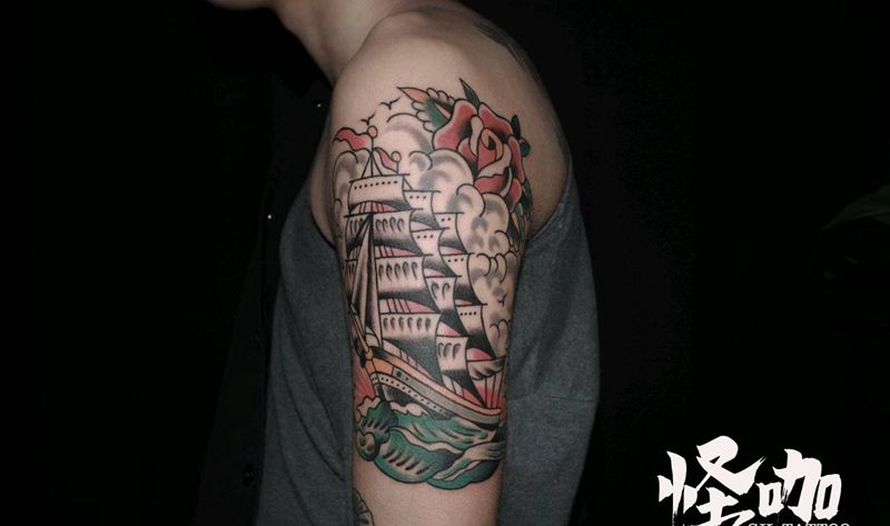 当前位置: 首页 >山东省青岛市纹身店-怪咖纹身刺青(凯德店)纹身图案>oldschool帆船纹身图片_手臂Old School纹身图案