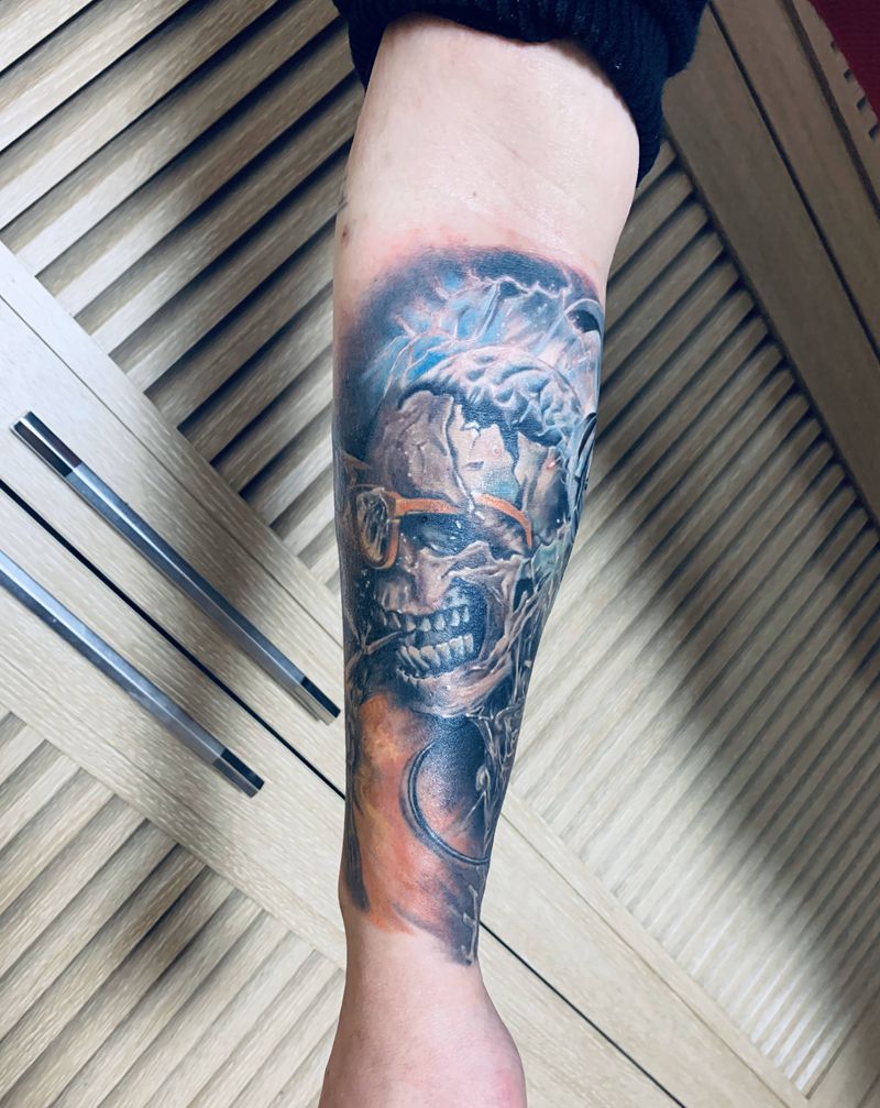 当前位置: 首页 >山东省青岛市纹身店-西海岸美术刺青纹身图案>骷髅音乐家纹身图片_手臂欧美写实暗黑纹身图案
